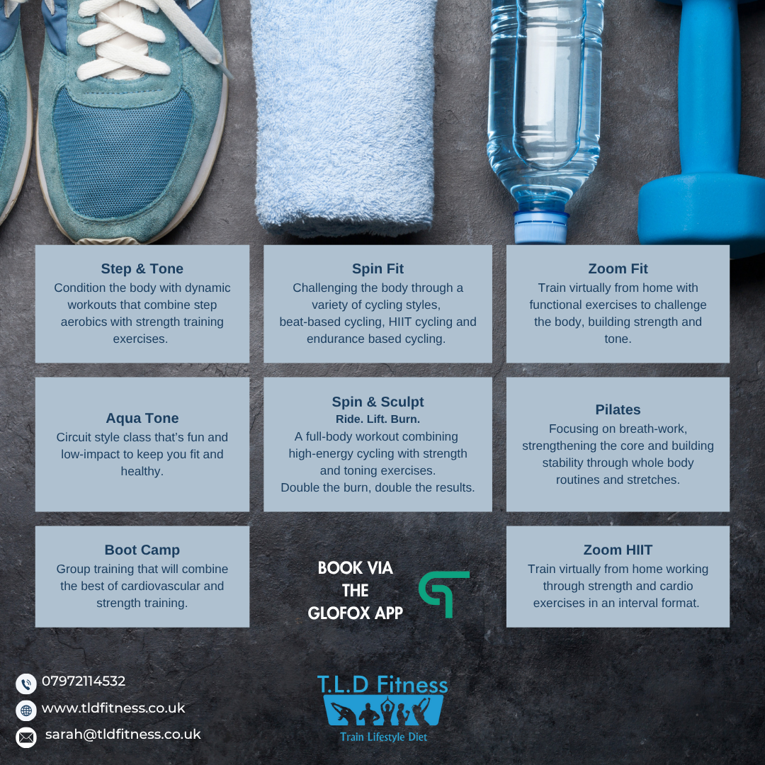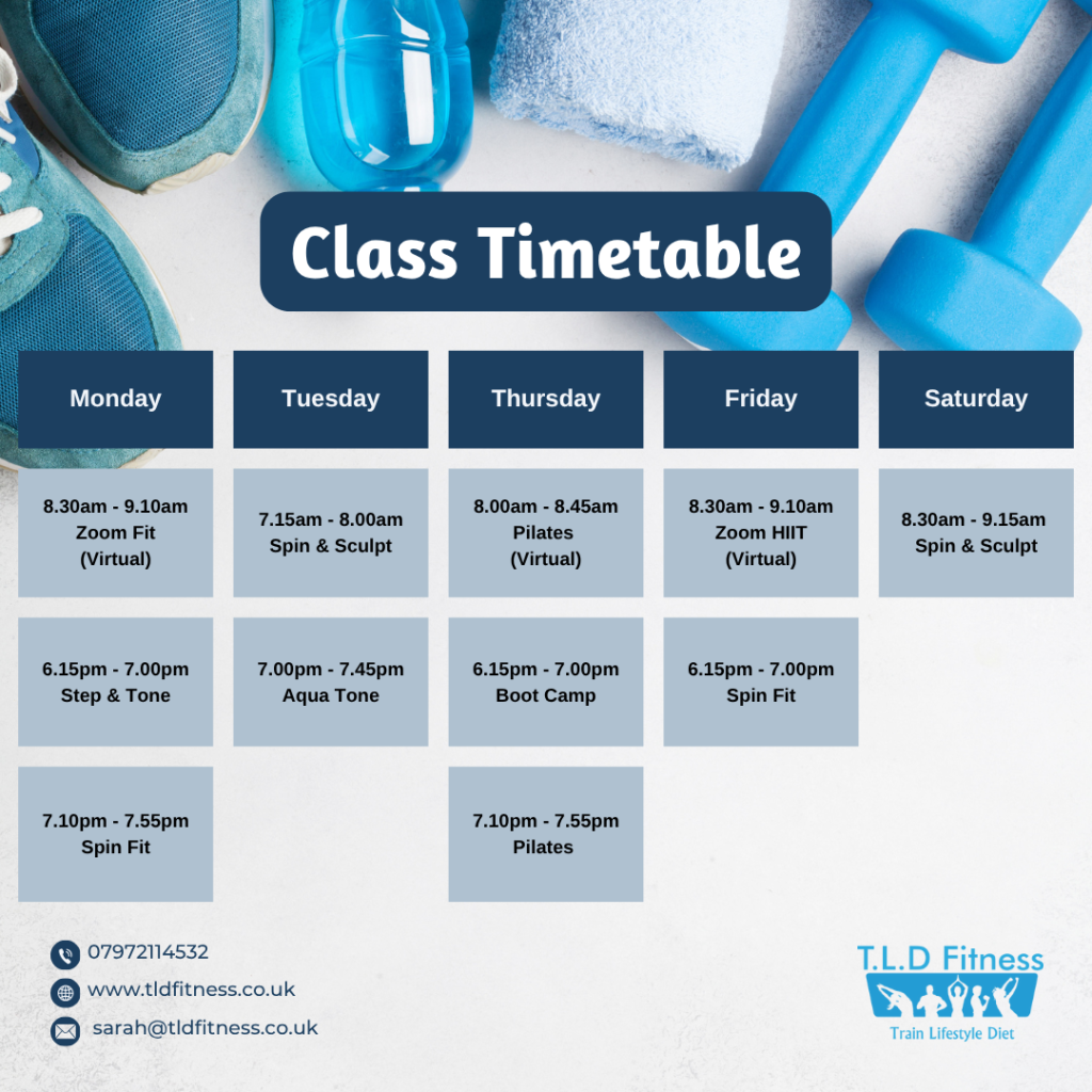 Booking for classes is essential to attend and can be completed online. All classes take place at TLD Fitness Studio except for Aqua Tone which is based at Moreton Fire College. Our Zoom classes are available virtually from the comfort of your own home.